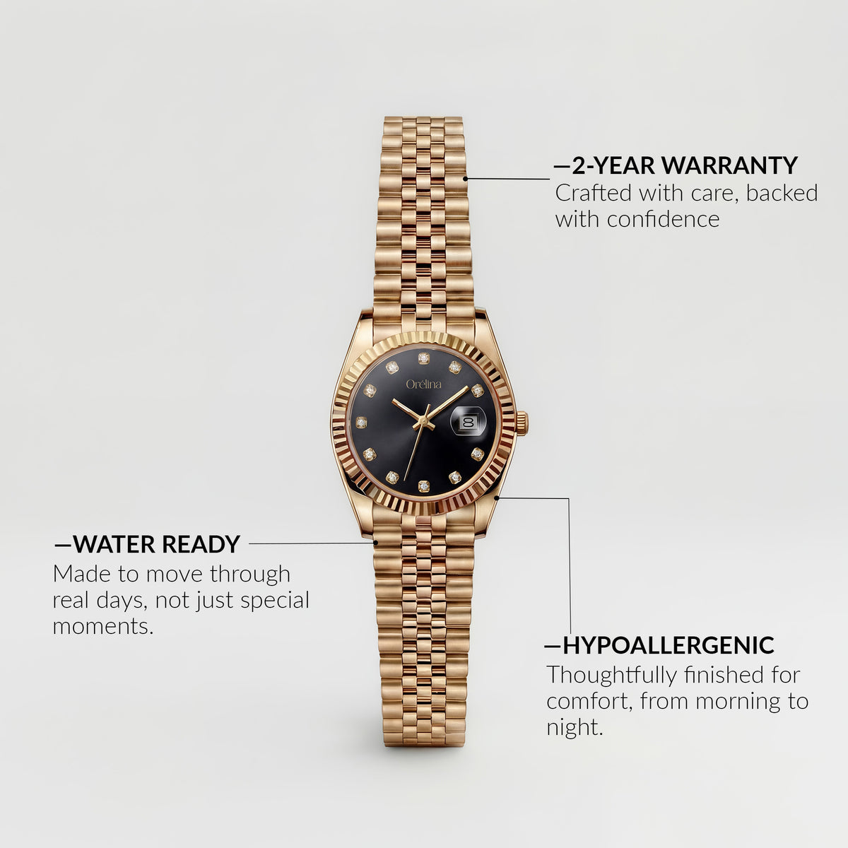 Each Orélina watch is crafted using carefully selected stainless steel chosen for its strength, longevity, and refined appearance. Designed to hold up to daily wear, it resists wear and maintains its finish over time.