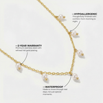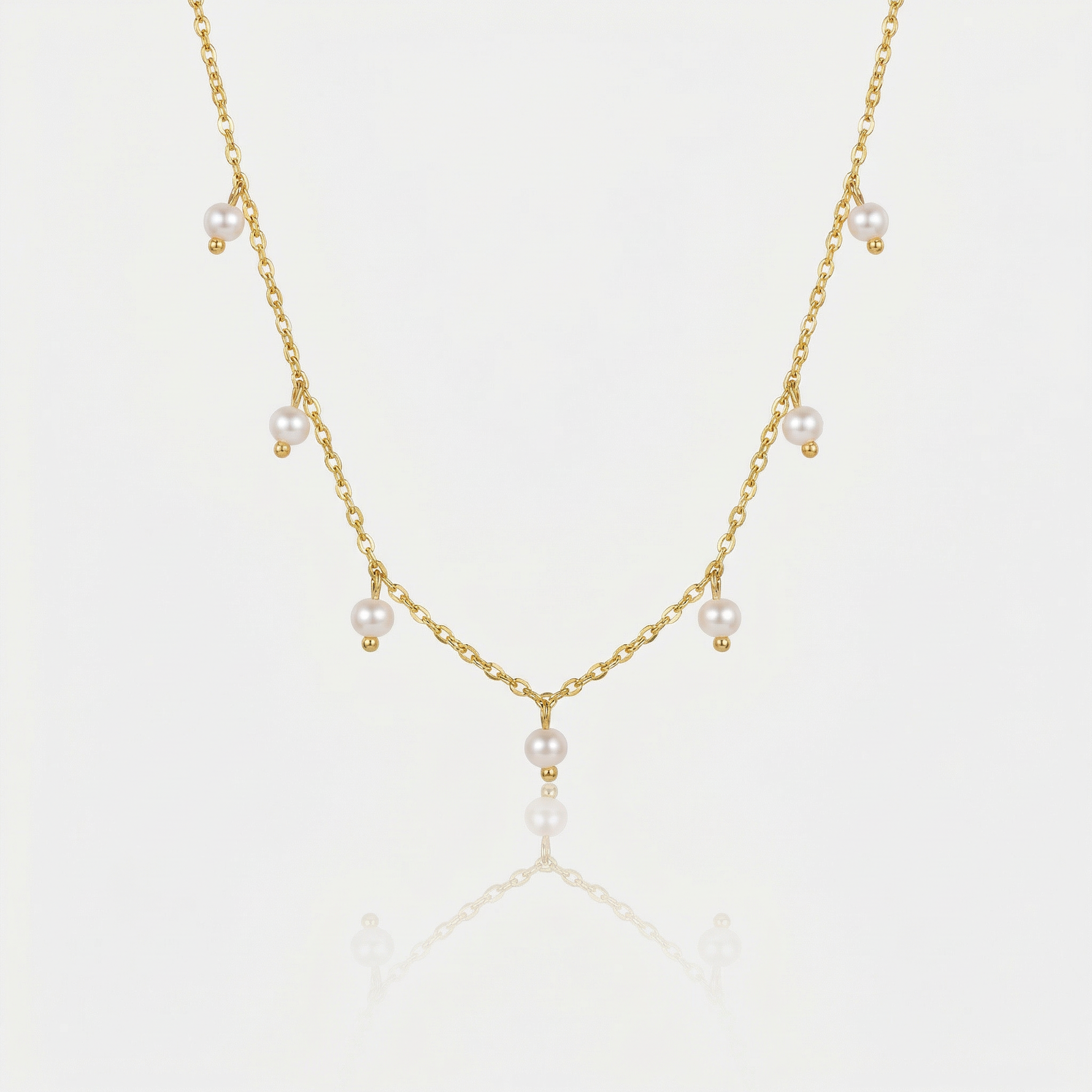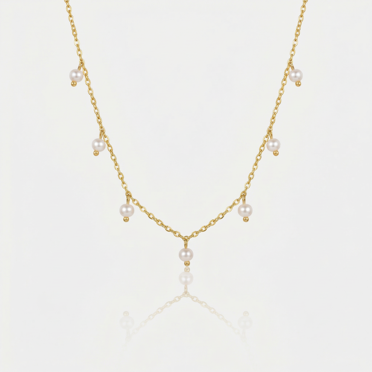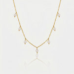 The Arléne Necklace captures delicate elegance with its graceful chain adorned with luminous pearl accents. Each small pearl charm adds a soft, refined glow, creating a timeless piece that feels both feminine and effortlessly sophisticated.