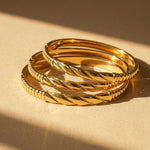 The Dorée Bracelet blends classic elegance with a modern twist. Featuring a refined twisted center detail and smooth gold bangle design, it creates a subtle statement that effortlessly elevates any outfit.