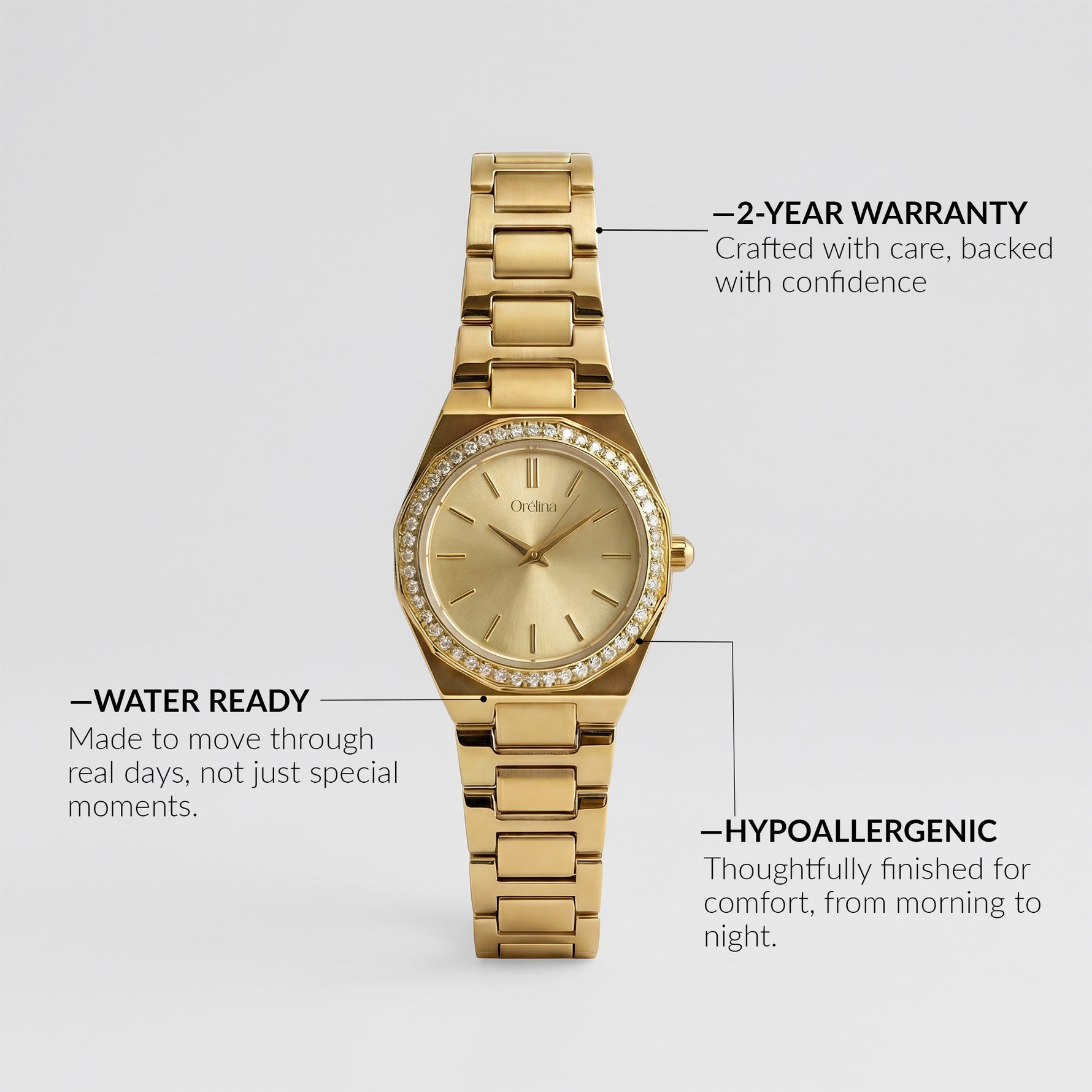 Each Orélina watch is crafted using carefully selected stainless steel chosen for its strength, longevity, and refined appearance. Designed to hold up to daily wear, it resists wear and maintains its finish over time.