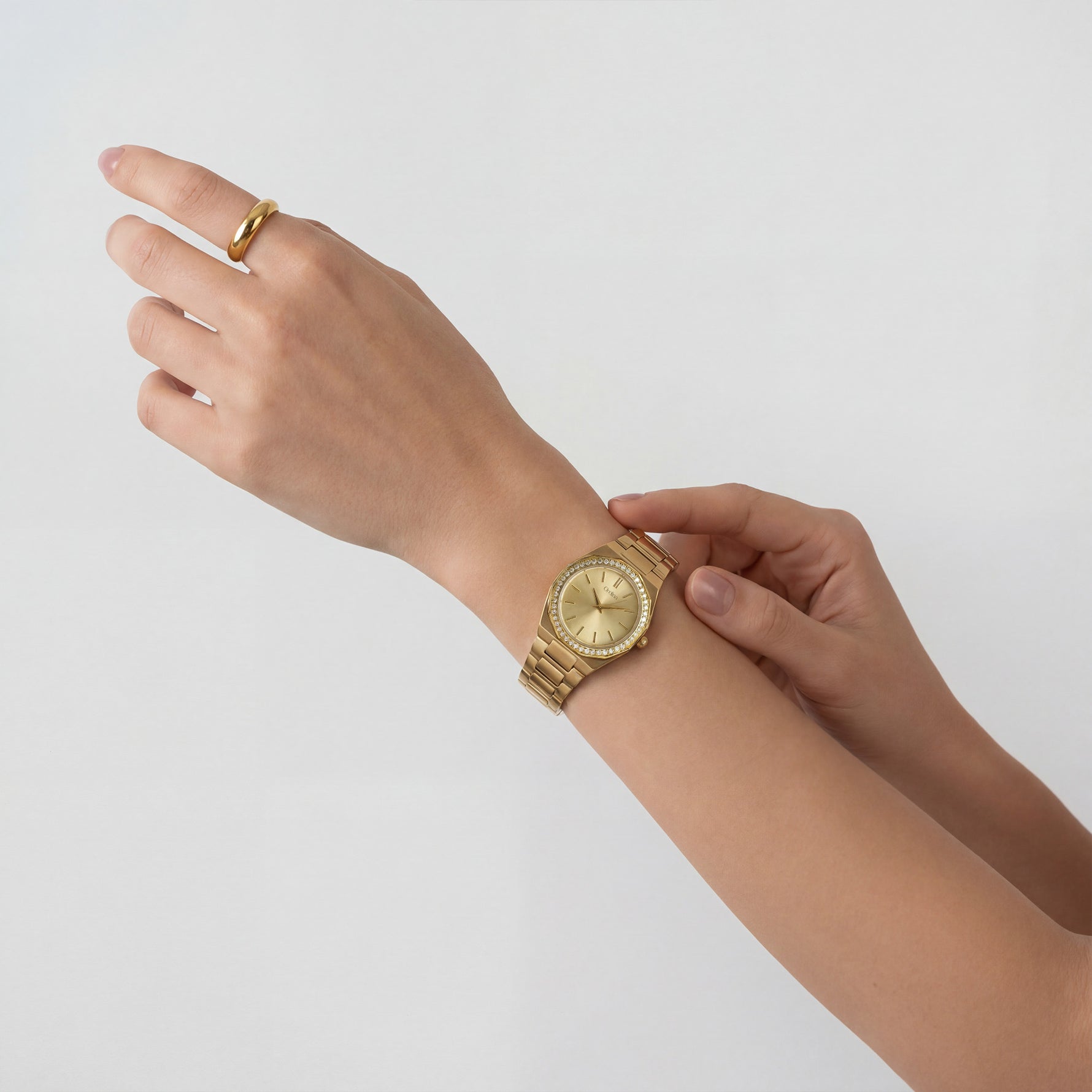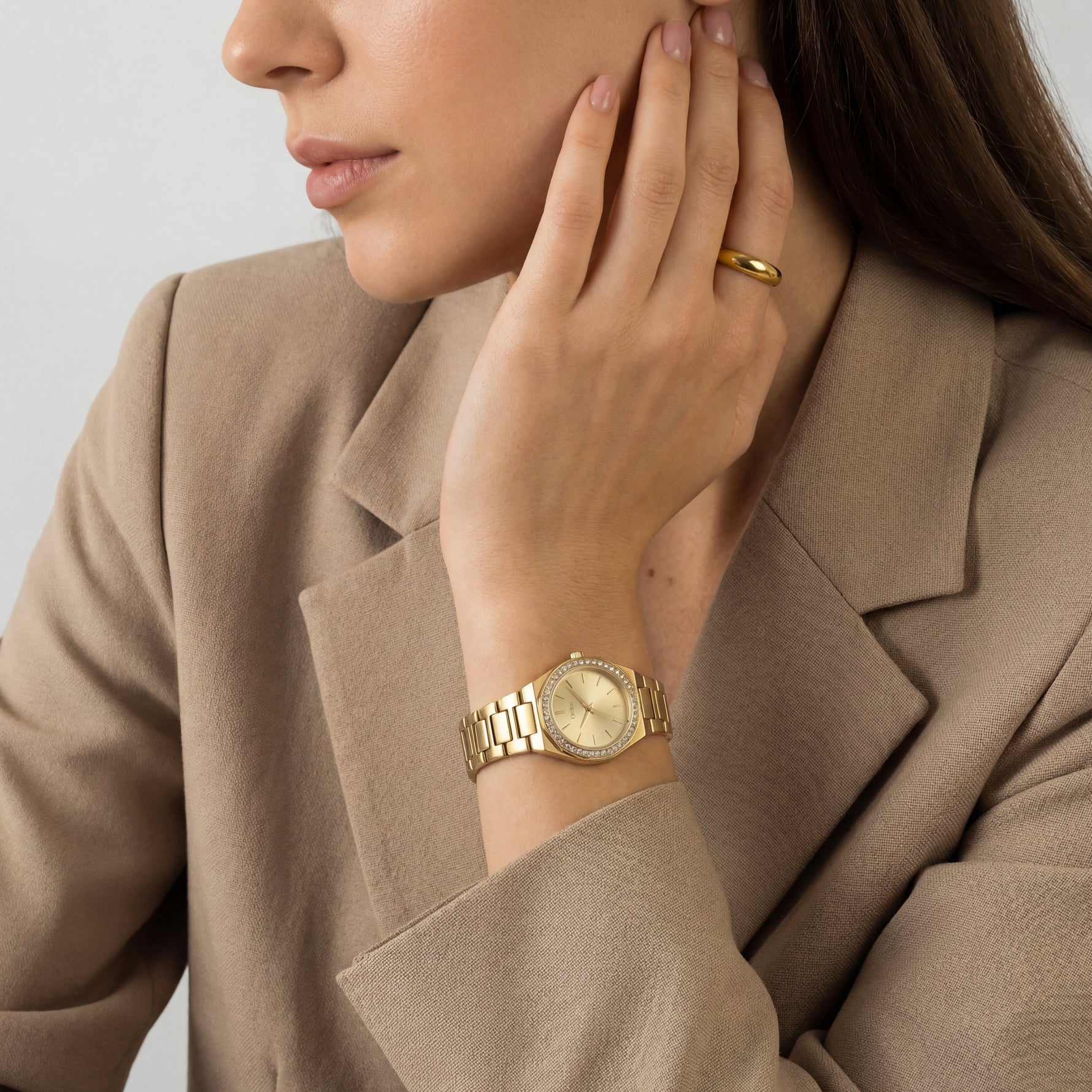 Its minimalist analog display keeps the design clean and timeless, while the polished stainless steel bracelet adds a touch of modern sophistication. The smaller 26 mm dial creates a classic, jewelry inspired silhouette that pairs beautifully with both everyday looks and evening styling.